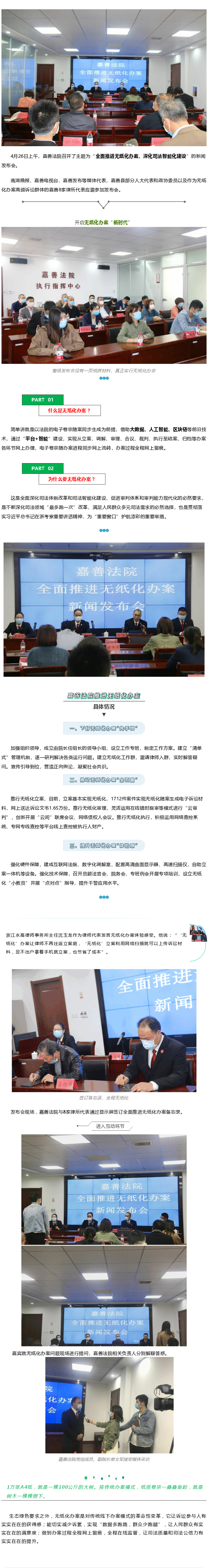 4月26日上午,嘉善法院召開(kāi)了一場(chǎng)讓人眼前一亮的主題為“全面推進(jìn)無(wú)紙化辦案,深化司法智能化建設(shè)”的新聞發(fā)布會(huì)。整場(chǎng)發(fā)布會(huì)沒(méi)有一頁(yè)紙質(zhì)材料,真正實(shí)行無(wú)紙化辦會(huì)。媒體代表、嘉善縣部分人大代表和政協(xié)委員以及作為無(wú)紙化辦案高頻訴訟群體的嘉善8家律所代表應(yīng)邀參加發(fā)布會(huì)。 嘉善法院全面推動(dòng)無(wú)紙化辦案“全覆蓋”。推行無(wú)紙化立案,目前,立案基本實(shí)現(xiàn)無(wú)紙化,1712件案件實(shí)現(xiàn)無(wú)紙化隨案生成電子訴訟材料,網(wǎng)上送達(dá)訴訟文書(shū)1.65萬(wàn)份。推行無(wú)紙化審理,靈活運(yùn)用在線錯(cuò)時(shí)庭審等模式進(jìn)行“云審判”,創(chuàng)新開(kāi)展“云間”聯(lián)席會(huì)議、網(wǎng)絡(luò)債權(quán)人會(huì)議。推行無(wú)紙化執(zhí)行,積極運(yùn)用網(wǎng)絡(luò)查控系統(tǒng)、專(zhuān)網(wǎng)專(zhuān)線查控等平臺(tái)線上查控被執(zhí)行人財(cái)產(chǎn)。 “‘無(wú)紙化’辦案讓律師不再往返立案庭,‘無(wú)紙化’立案利用網(wǎng)絡(luò)掃描就可以上傳訴訟材料,足不出戶拿著手機(jī)就立案,也節(jié)省了成本。”浙江永高律師事務(wù)所主任沈玉龍作為律師代表發(fā)言無(wú)紙化辦案體驗(yàn)感受。 發(fā)布會(huì)現(xiàn)場(chǎng),嘉善法院與8家律所代表通過(guò)顯示屏簽署《關(guān)于全面推進(jìn)無(wú)紙化辦案的合作備忘錄》(以下簡(jiǎn)稱(chēng)《備忘錄》)?!秱渫洝吠ㄟ^(guò)明確無(wú)紙化立案的14條細(xì)則,讓“掌上辦案、指尖訴訟”惠及更多律師和當(dāng)事人。 1萬(wàn)張A4紙,就是一棵100公斤的大樹(shù)。按傳統(tǒng)辦案模式,紙質(zhì)卷宗一疊疊壘起,就是樹(shù)木一棵棵倒下。生態(tài)綠色要求之外,無(wú)紙化辦案是對(duì)傳統(tǒng)線下辦案模式的革命性變革,它讓訴訟參與人有實(shí)實(shí)在在的獲得感;能切實(shí)減少訴累,實(shí)現(xiàn)“數(shù)據(jù)多跑路,群眾少跑腿”,讓人民群眾有實(shí)實(shí)在在的滿意度;做到辦案過(guò)程全程網(wǎng)上留痕,全程在線監(jiān)管,讓司法質(zhì)量和司法公信力有實(shí)實(shí)在在的提升。