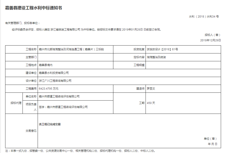 嘉興市北部湖蕩整治及河湖連通工程(嘉善片)三標段中標結果公示