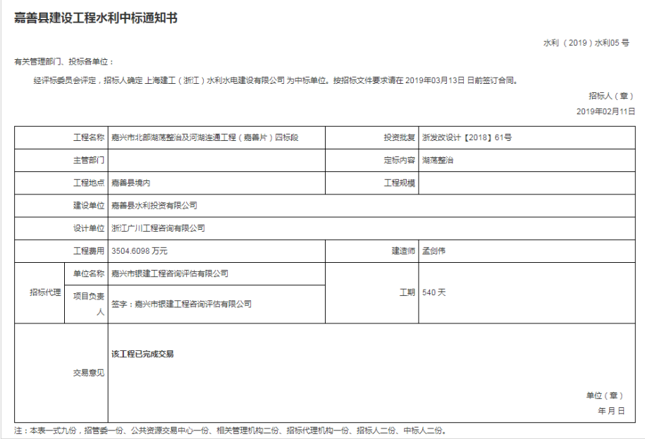 嘉興市北部湖蕩整治及河湖連通工程(嘉善片)四標段中標結果公示