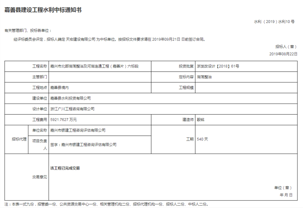 嘉興市北部湖蕩整治及河湖連通工程(嘉善片)六標(biāo)段中標(biāo)結(jié)果公示