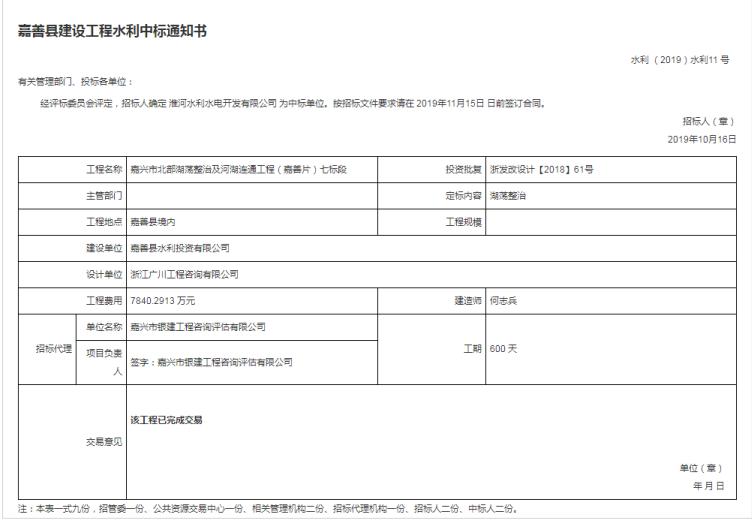嘉興市北部湖蕩整治及河湖連通工程(嘉善片)七標段中標結果公示