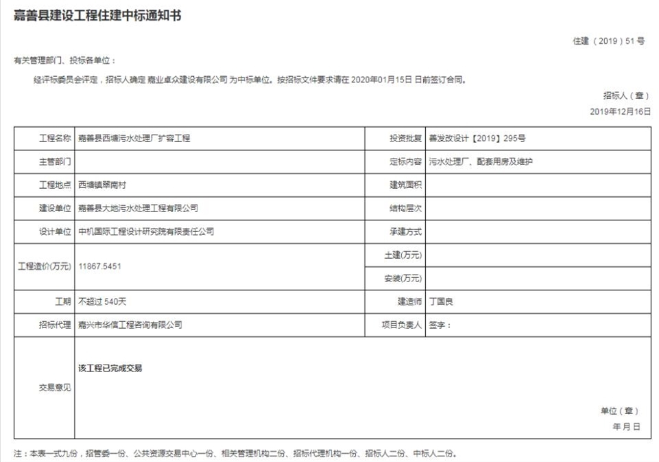 嘉善縣西塘污水處理廠擴容工程中標結果公示