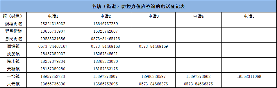嘉善縣各鎮(街道)防控辦值班咨詢電話