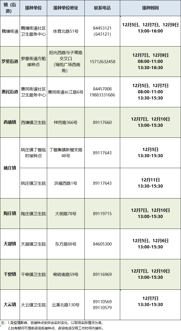 2022年12月5日~12月11日 嘉善縣注射式新冠疫苗接種安排