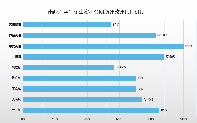 各鎮(zhèn)、開發(fā)區(qū)(街道)黨委、人民政府(辦事處): 近期我辦結(jié)合日常督查暗訪情況,通過(guò)“民生地圖”實(shí)時(shí)在線監(jiān)測(cè)系統(tǒng)全面梳理匯總了嘉善縣農(nóng)村公廁新建改建項(xiàng)目總體進(jìn)展,現(xiàn)將有關(guān)情況通報(bào)如下: 一、總體推進(jìn)情況 從項(xiàng)目總體實(shí)施進(jìn)度看,截至7月,21個(gè)民生實(shí)事農(nóng)村公廁新改建項(xiàng)目平均進(jìn)度為74.52%,其中惠民街道已完成,西塘鎮(zhèn)、大云鎮(zhèn)、羅星街道推進(jìn)較快,總體進(jìn)度在80%以上,超過(guò)面上平均水平;魏塘街道、姚莊鎮(zhèn)總體進(jìn)度較慢,均在60%以下。