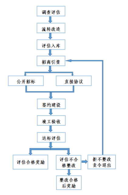 操作流程 | ①調查評估;②流轉改造;③評估入庫;④招商引資;⑤簽約建設;⑥竣工驗收;⑦達標評估;⑧獎懲激勵。 |