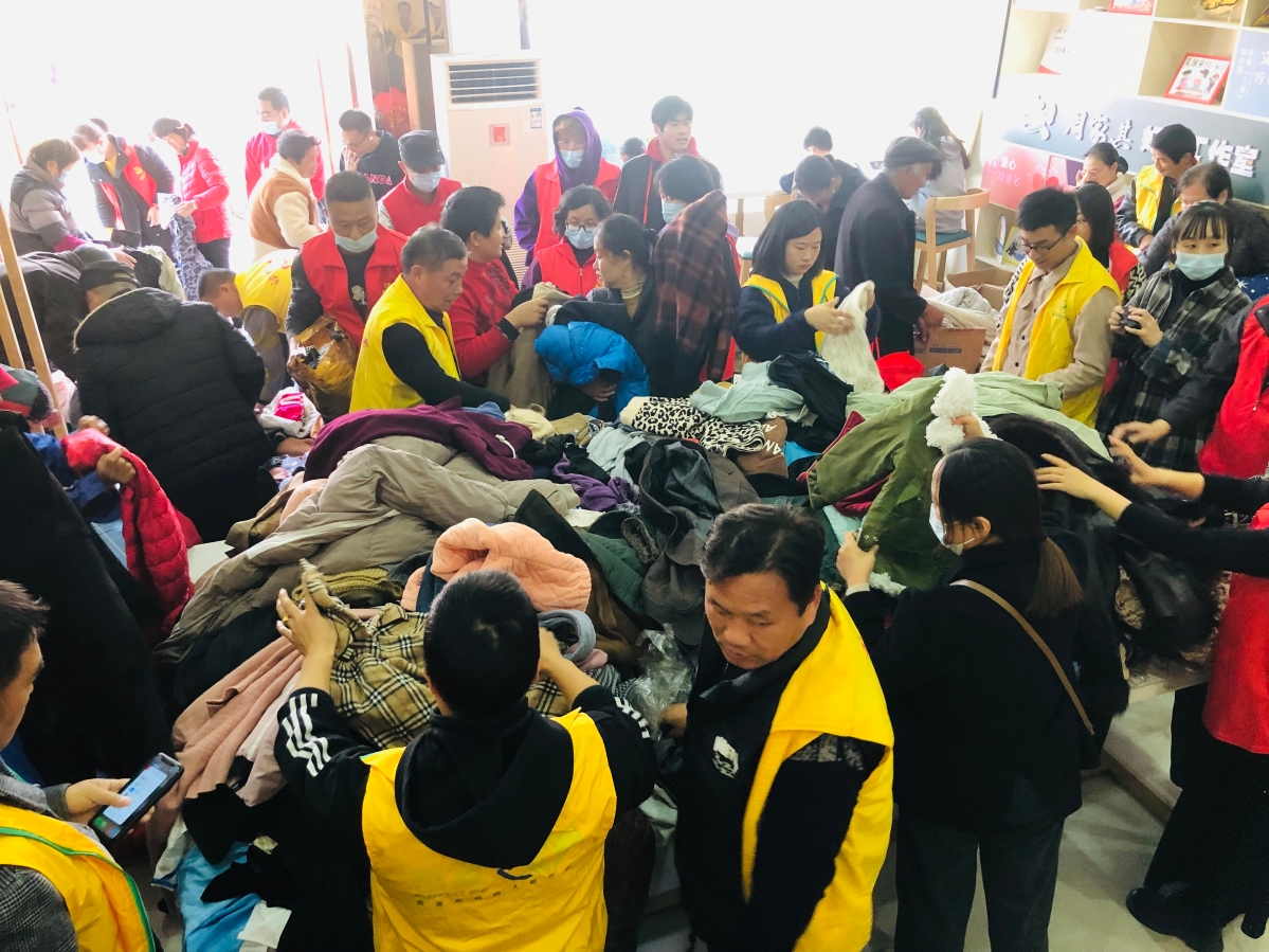 ?▲志愿者們在捐贈現場整理保暖衣物